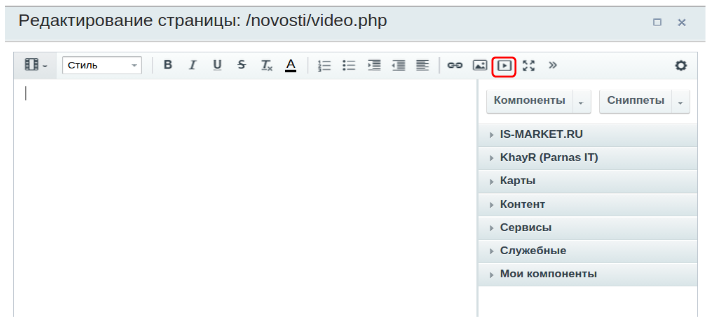 Зайдите на страницу, на которой вы хотите разместить видеоролик и перейдите в режим редактирования и кликните на иконку “Загрузить видео”: