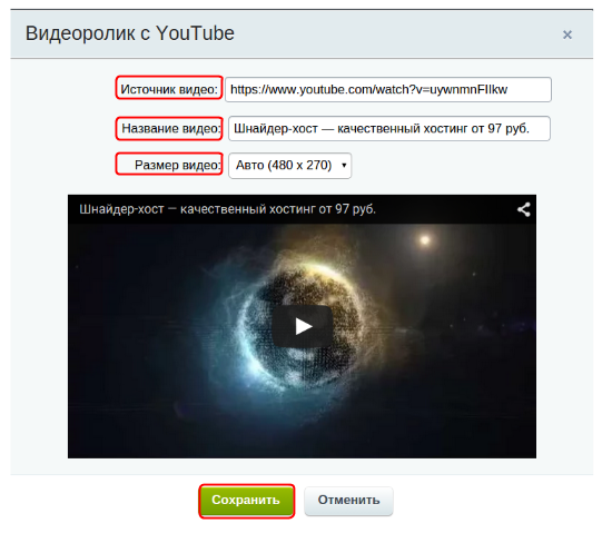 Вставьте ссылку на ролик в поле “Источник видео” и задайте нужный размер. Название видео подтянется автоматически, но при желании вы можете поменять его на свой вариант: