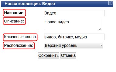 Чтобы загрузить видео с компьютера, нужно проделать практически те же действия, что и при добавлении галереи на Битрикс: зайдите в раздел “Медиабиблиотека” → “Видео” → “Новая коллекция” → “Название” → “Описание” → “Ключевые слова” → “Расположение” → “Сохранить”: