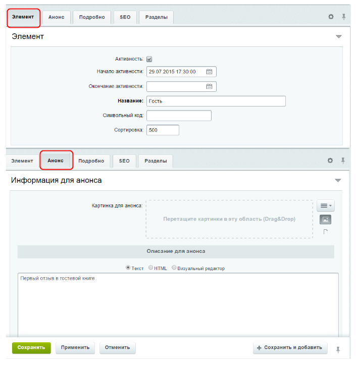 Следующий шаг ― добавление тестой записи, которая отобразится в гостевой книге: “Администрирование” → “Контент” → “Интерактив” → “Гостевая книга” → “Добавить элемент” → “Элемент”. В этом случае “Начало активности” ― дата и время отправки “комментария”, а “Название” ― имя автора. Во вкладке “Анонс” добавляется текст послания: