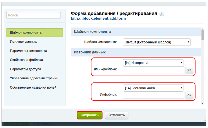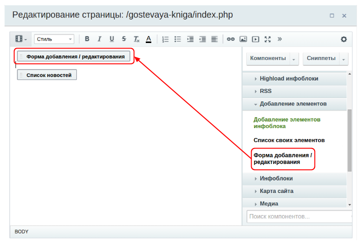 Чтобы вывести тестовую запись в гостевую книгу нужно перейти на сайт → “Гостевая книга” → “Изменить страницу” и поставить компонент “Список новостей” (в настройках нужно выбрать “Тип информационного блока” → “”Интерактив”, “Код информационного блока” → “Гостевая книга”. Теперь в “Гостевой книге” вывелся тестовый отзыв. Далее нужно добавить форму для заполнения. Вернитесь на страницу редактирования гостевой книги и добавьте компонент “Контент” → “Добавление элементов” → “Форма добавления/редактирования”: