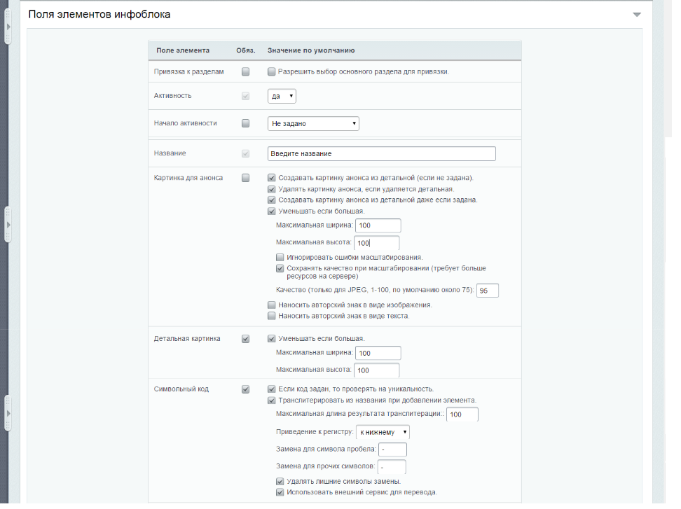 В разделе “Добавить инфоблок” → “Поля элементов инфоблока” задаются параметры активности, изображений и т.д. Обратите внимания, что пункты, отмеченные галочками в поле “Обязательные”, являются будут обязательными для заполнения: