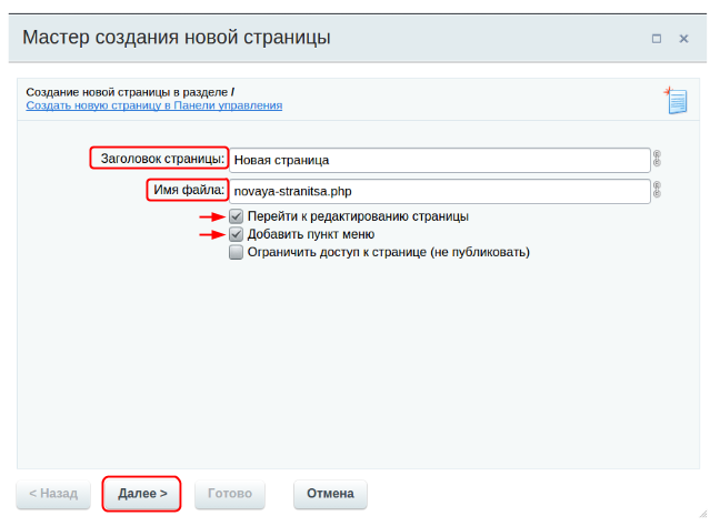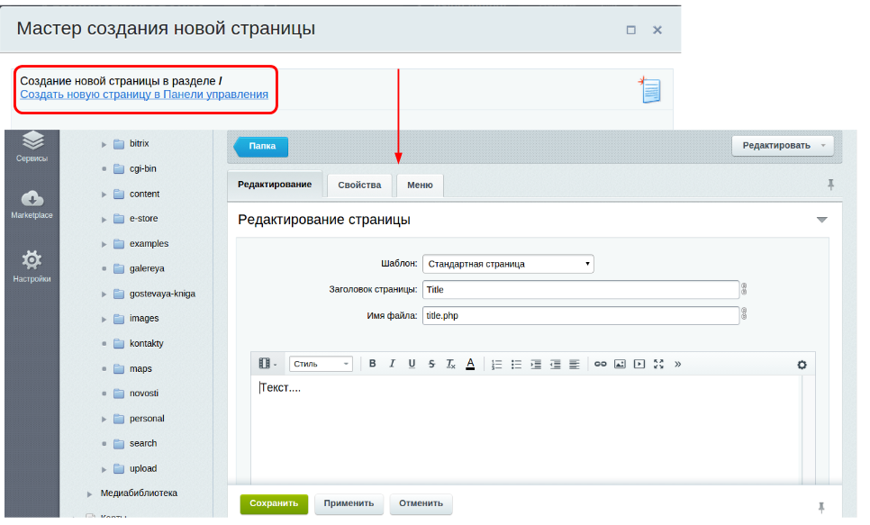 Теперь, когда “Мастер создания новой страницы” запущен, вы можете кликнуть на ссылку “Создать новую страницу в Панели управления” и продолжить работать в панели администрирования: