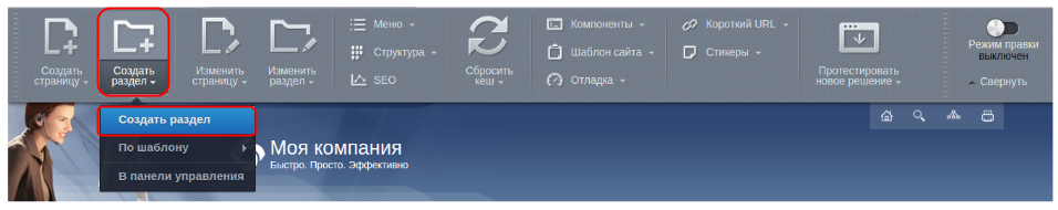 Если говорить о статической информации, раздел можно считать папкой, а страницу ー файлом. Чтобы создать страницу в публичной части, кликните на кнопку “Создать страницу”:
